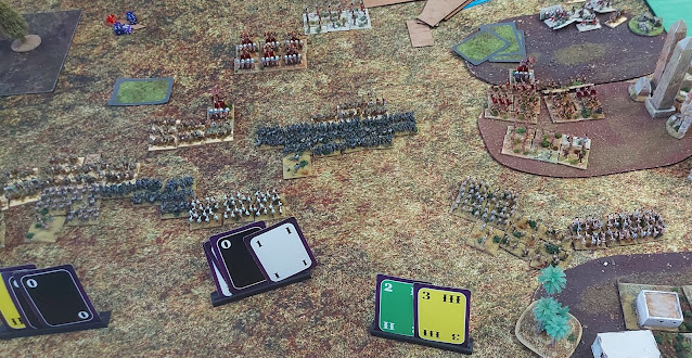 The sacrifices at lunchtime must have worked as - in the scouting cards fell in favour of Psamtik (the Medjai had worked hard to work out the Phoenecian forces motives and actions, and the usual bribes had worked too). Two red cards = 40% each, while Ray's sole coloured yellow was worth 20%. He had to deploy 60%. We were attacking into Phone-Is-Cain territory too, obviously Psamtik wa8hnted to rebuild his lost realm!